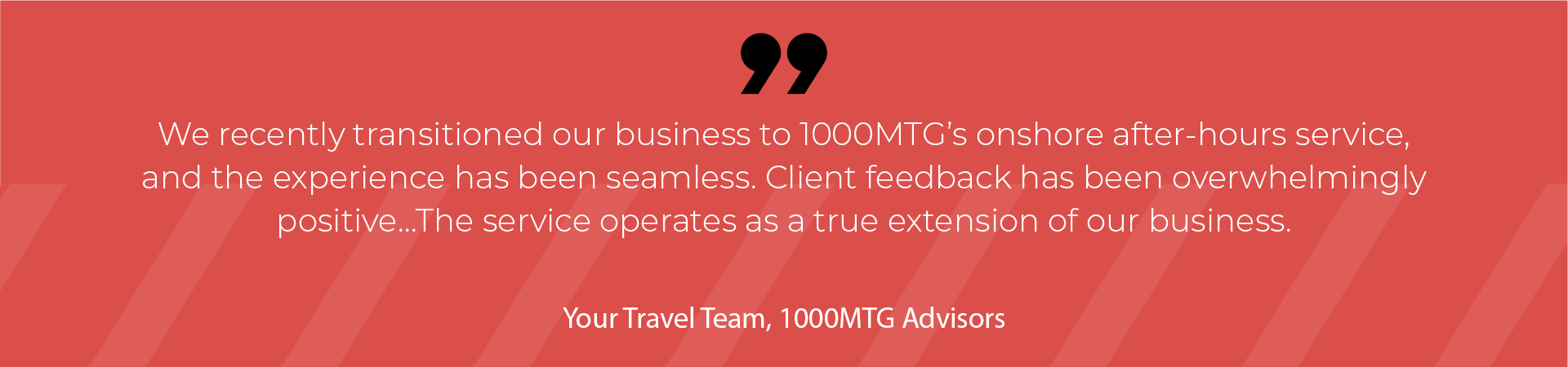 “We recently transitioned our business to 1000MTG’s onshore after-hours service, and the experience has been seamless. Client feedback has been overwhelmingly positive… The service operates as a true extension of our business, ensuring our clients continue to receive attentive and professional care when we are unavailable,” said 1000MTG advisors Emily Davidson and Stephanie McDonald, Your Travel Team.